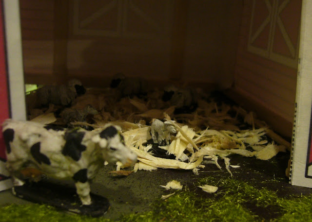 While waiting for the miniatures, I cut out some scrap MDF board to make a custom shadowbox, rather than use an old shoebox. My first thought was to build a barn similar to the