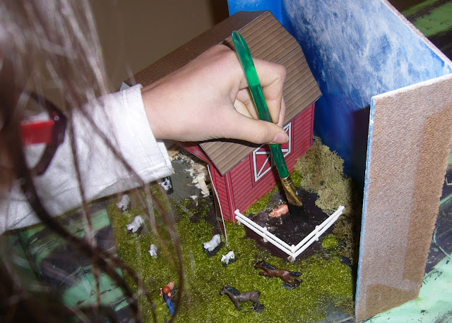 For the final stages of this, I let Sydney use the hot glue gun to secure the pieces to the board. We ended up using some wood shavings for a hamster cage to represent the hay in the barn. Then applying a thinned coat of white glue to secure the static grass.